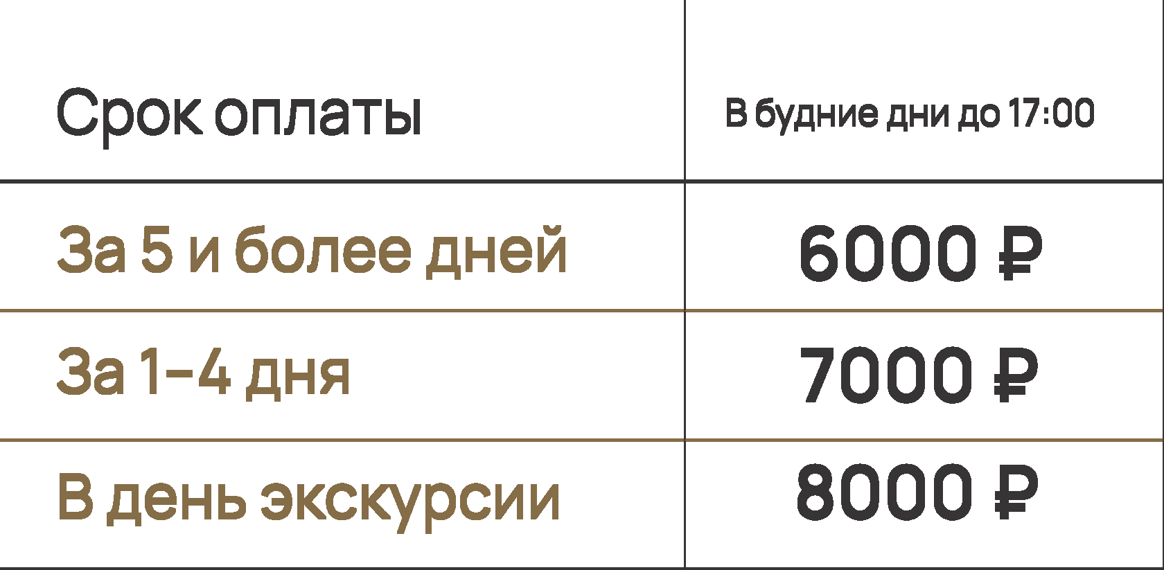 Стоимость путевки зависит от дня недели и времени проведения экскурсии: в будние дни до 17:00 – 1 500 рублей, в будние дни после 17:00 и в выходные – 1 800 рублей.