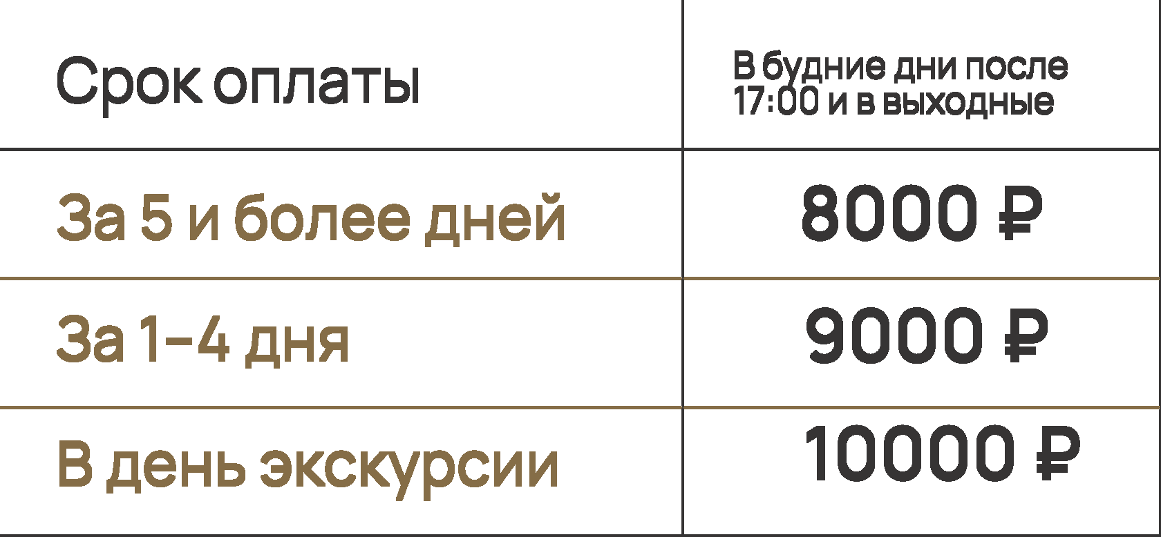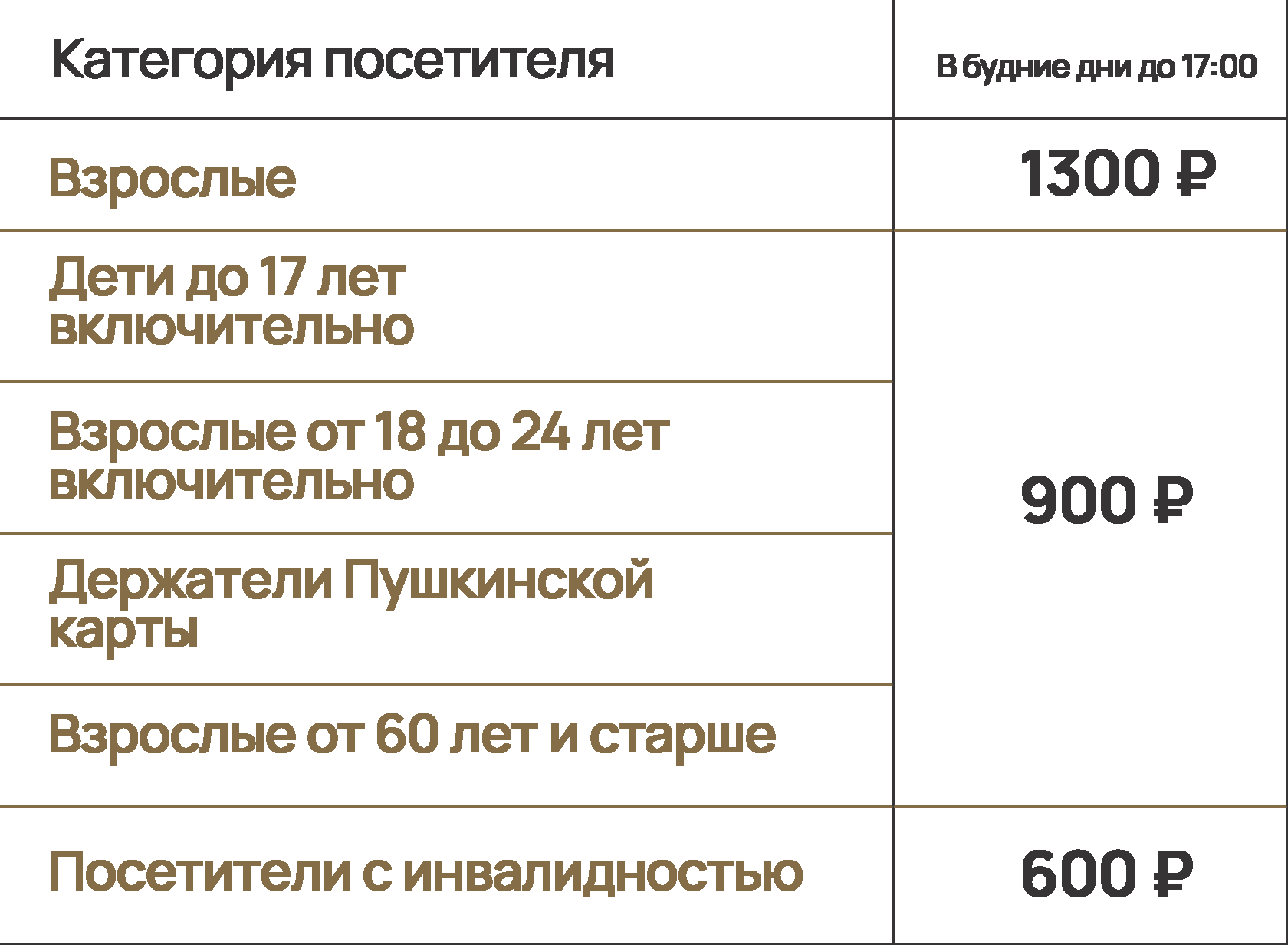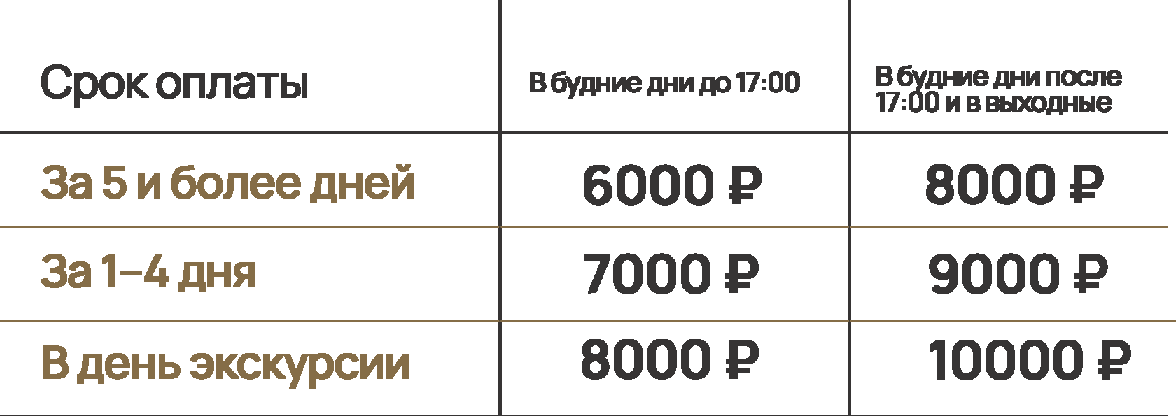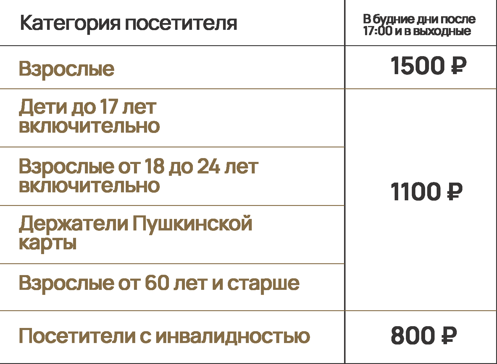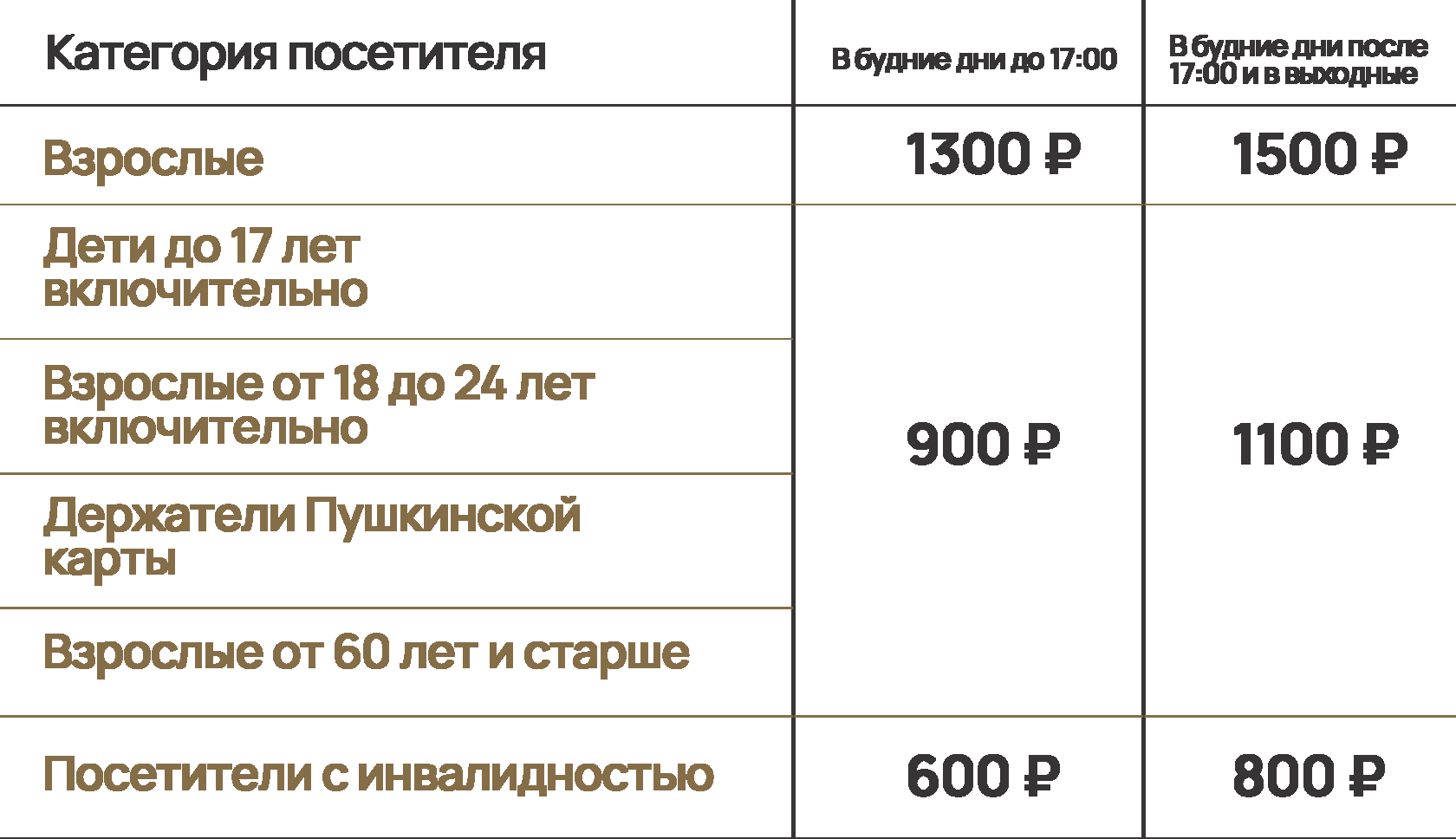 Стоимость путевки зависит от дня недели и времени проведения экскурсии, а также от категории посетителя.